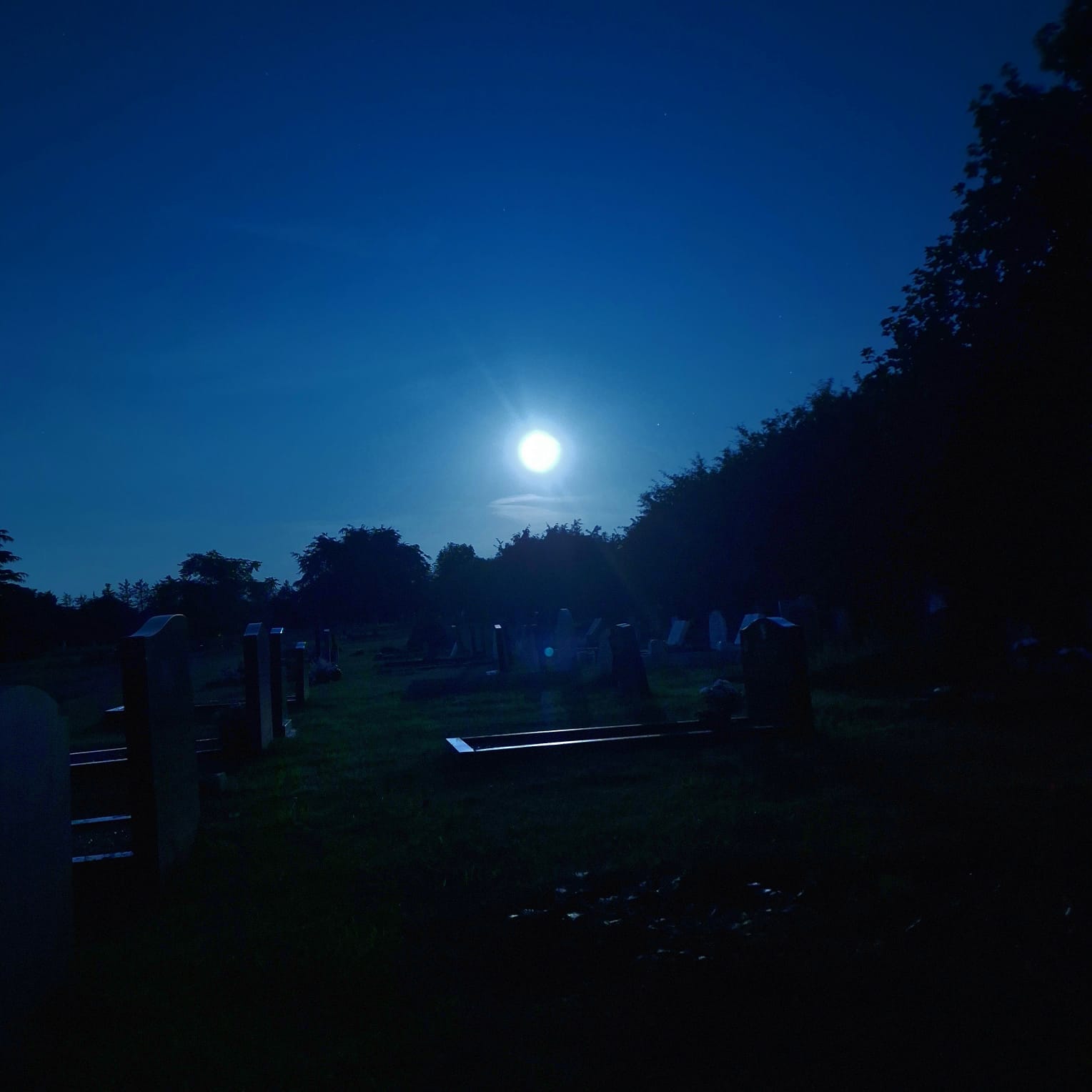 Summer; the sun is at its highest and the full moon at its lowest. Light is at its highest, darkness is at its lowest. The moon's orbital plane is tilted, and this full moon is the lowest we'll see until 2043! A graveyard is low enough.