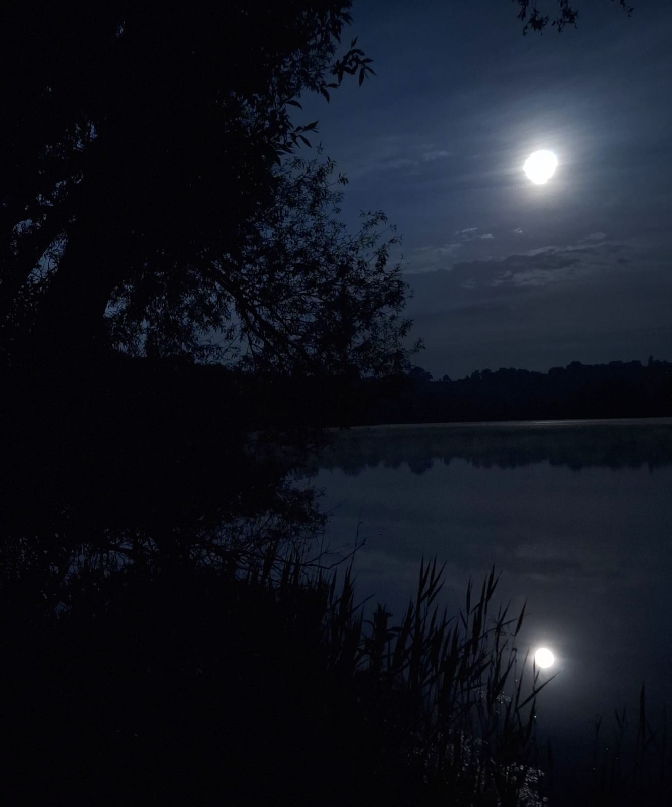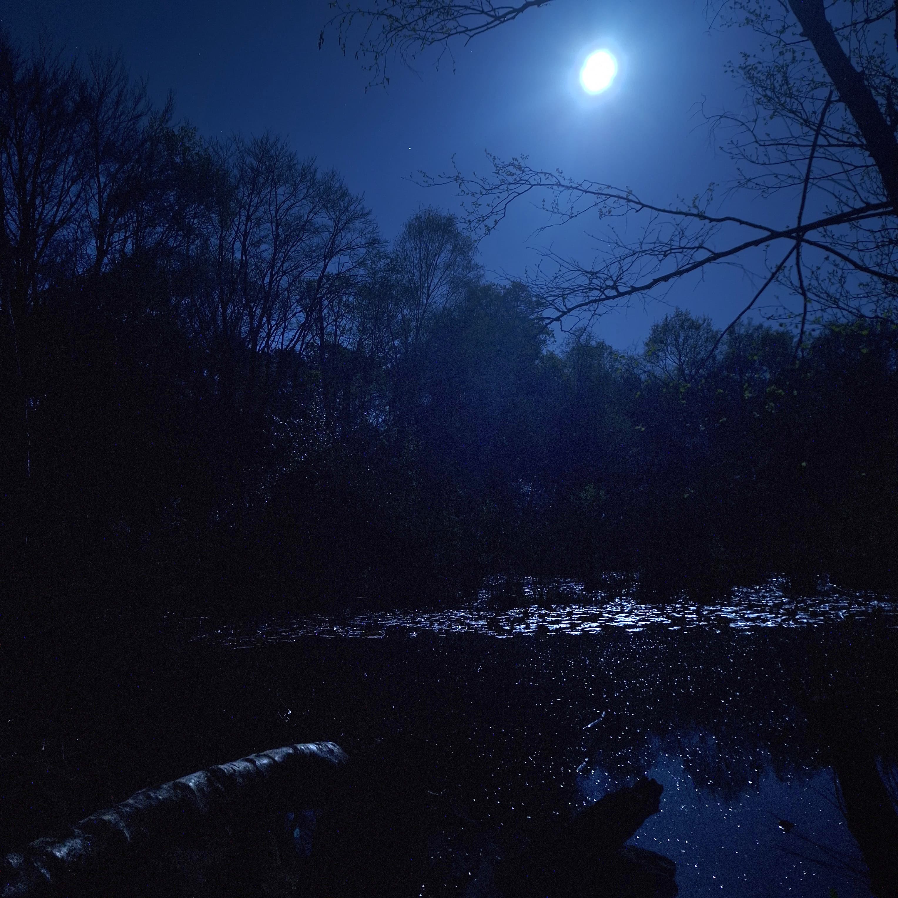 In the moonlit woods, by a lake on a lovely clear night. It's a micro-moon, shining from furthest distance in its elliptical orbit. As we approach summer solstice the full moon will rise lower in the sky... low enough to capture a lake reflection next?
